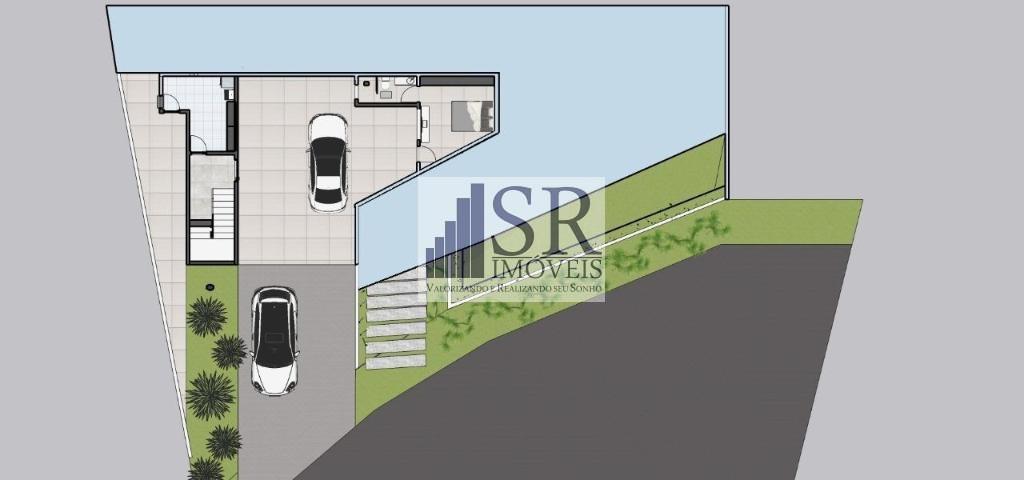 Garagem coberta para quatro carros, suíte com banheiro, lavanderia e hall da escada.
